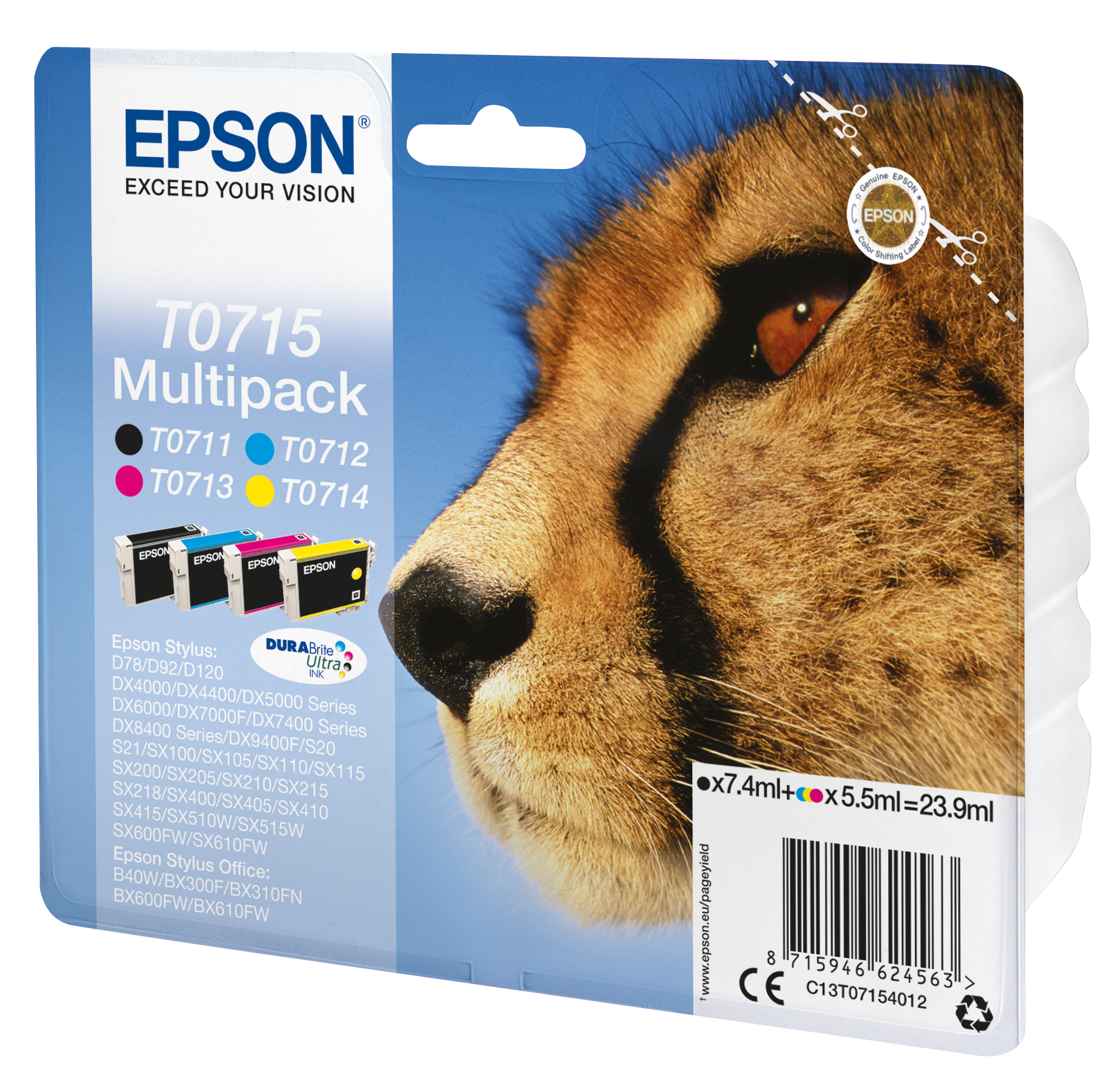 Epson T0715 Multipack – Pack de 4 – 23.9 ml – preto, amarelo, azul cyan, magenta – original – tinteiro – para Stylus DX9400, SX115, SX210, SX215, SX218, SX415, SX515, SX610, Stylus Office BX310, BX610
